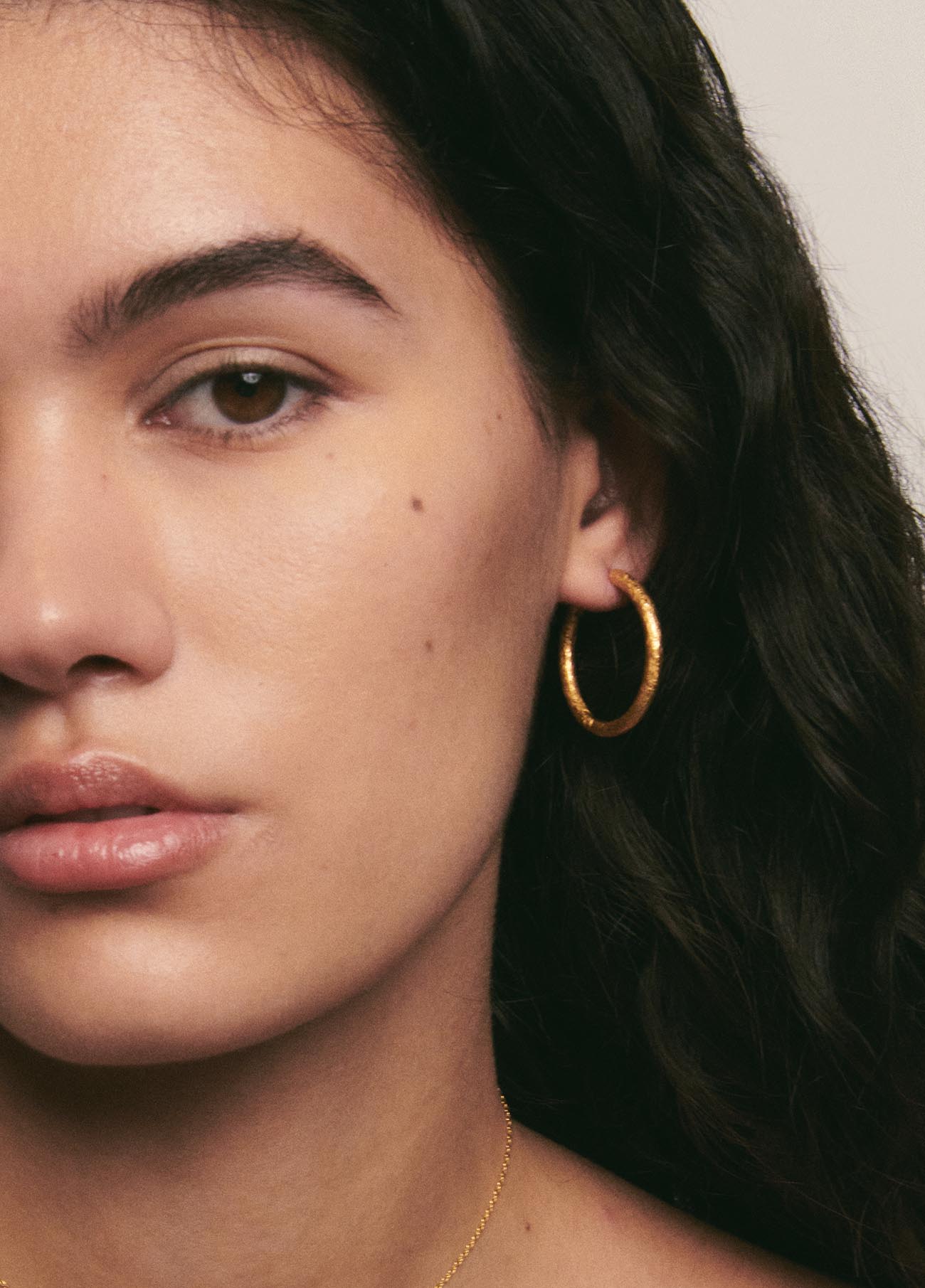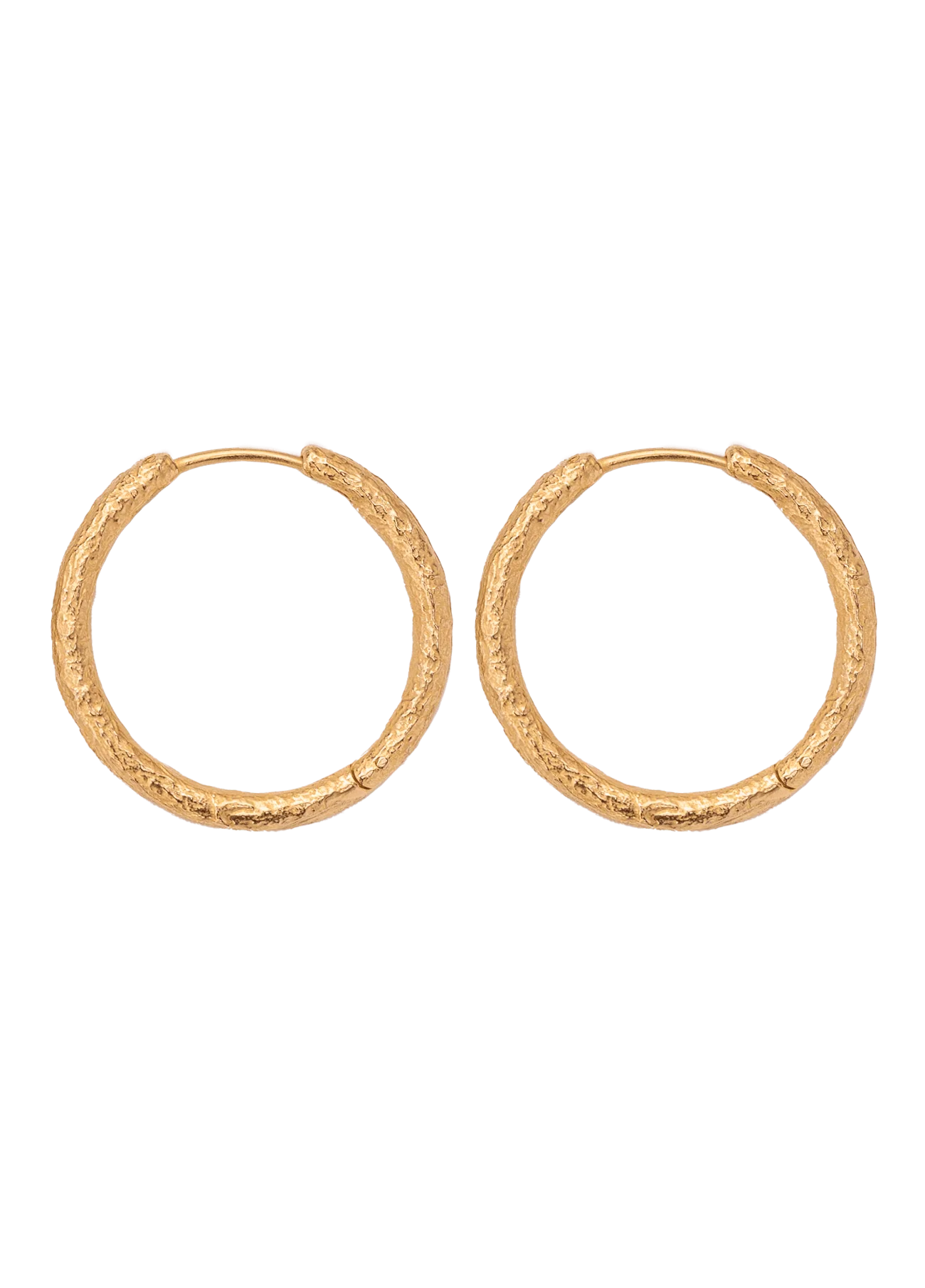 Par de aros de superficie rugosa, delicados e imperfectos, inspirados en los aros flamencos pero con un peso apropiado para el día a día. Tienen el equilibrio perfecto entre un aro sencillo y una pieza de joyería especial y única. Bañados en oro de 24 k.