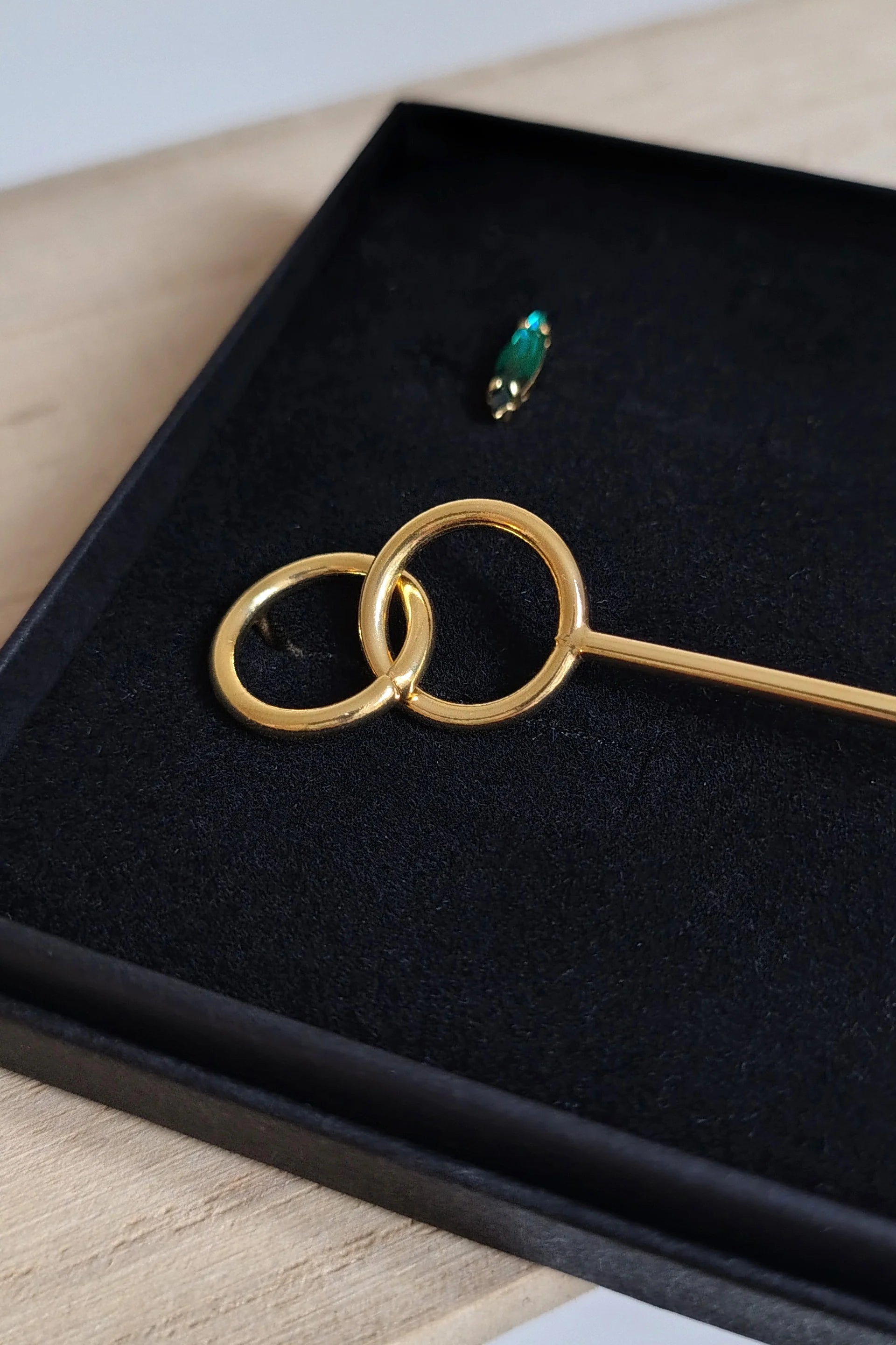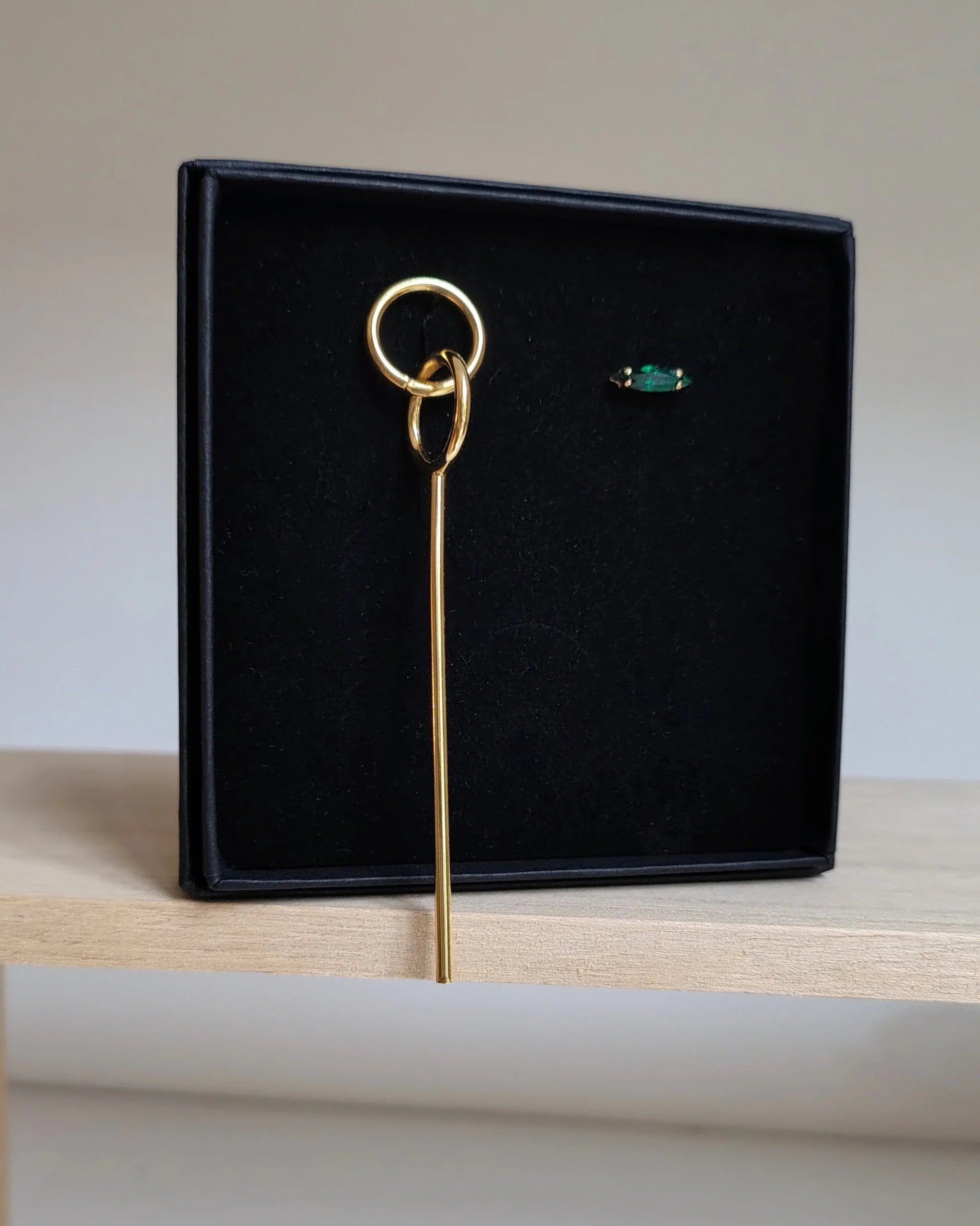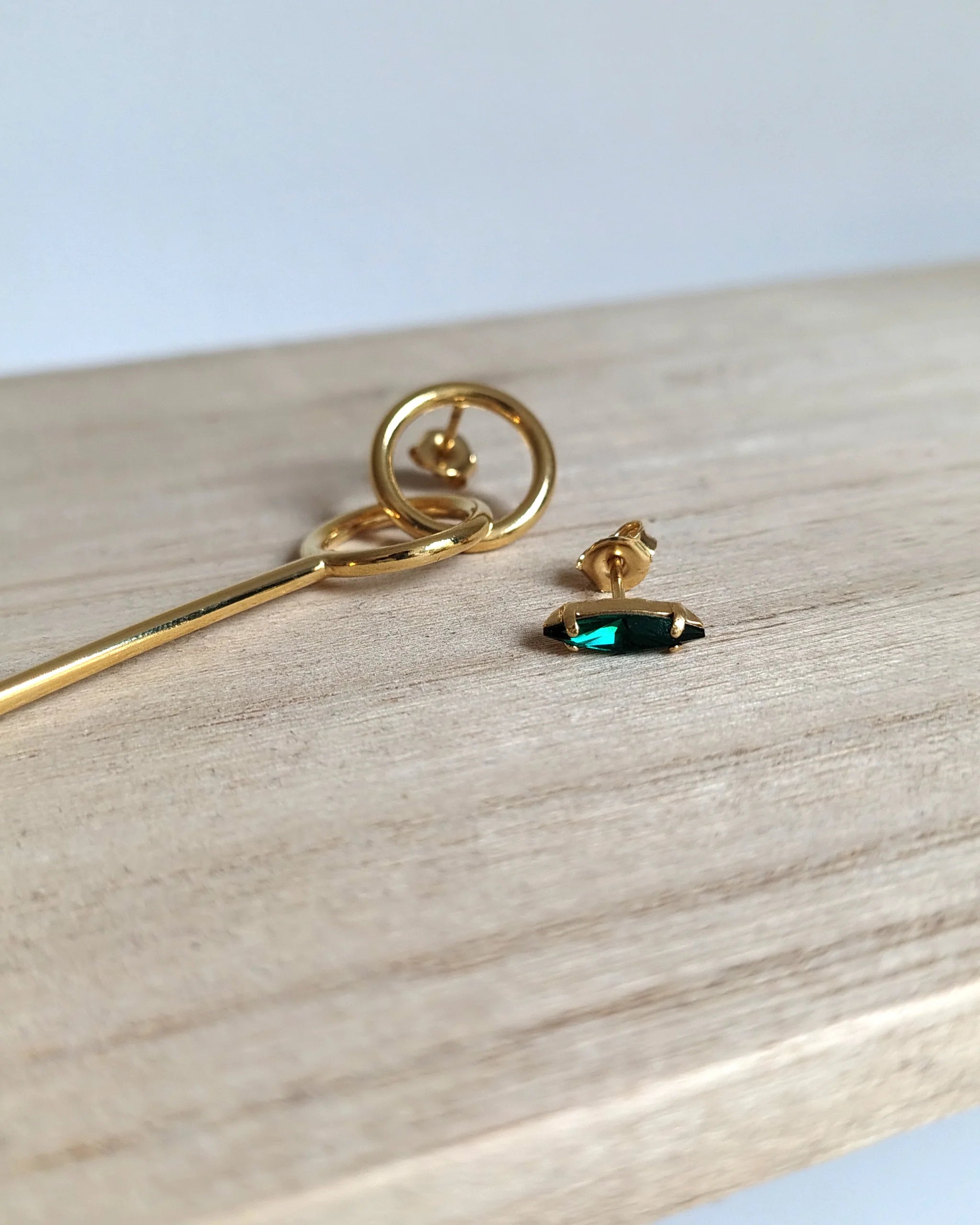 Didi explora la asimetría como una forma discreta de expresión. Una fina barra de oro contrasta con un delicado cristal verde.