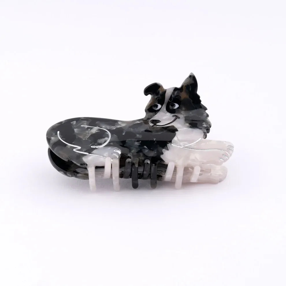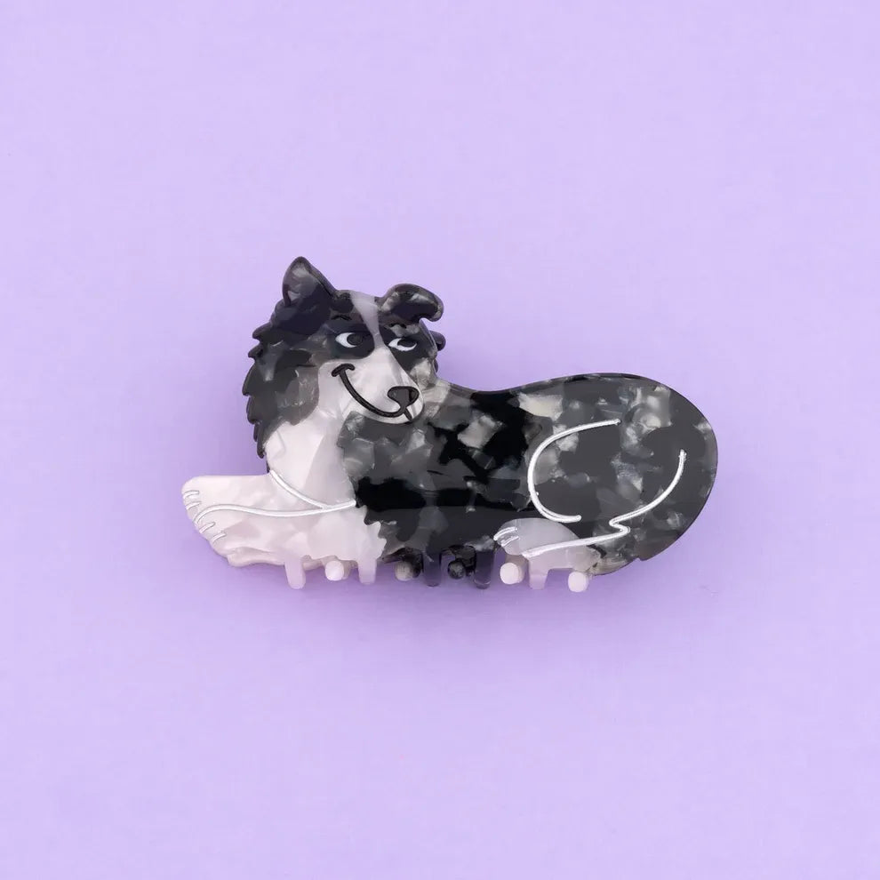 Una bonita pinza para el pelo en blanco y negro en homenaje al Border Collie. Este perro tan hiperactivo como elegante, con su largo pelo sedoso volando al viento durante sus frenéticas carreras en el bosque, optó por una siesta.